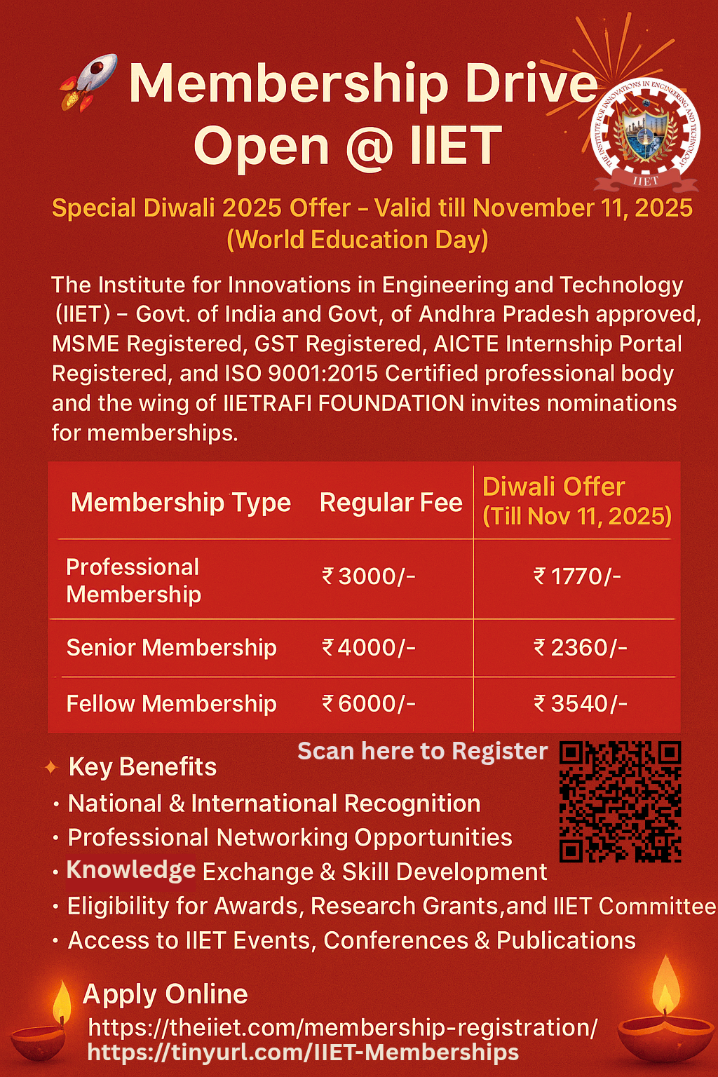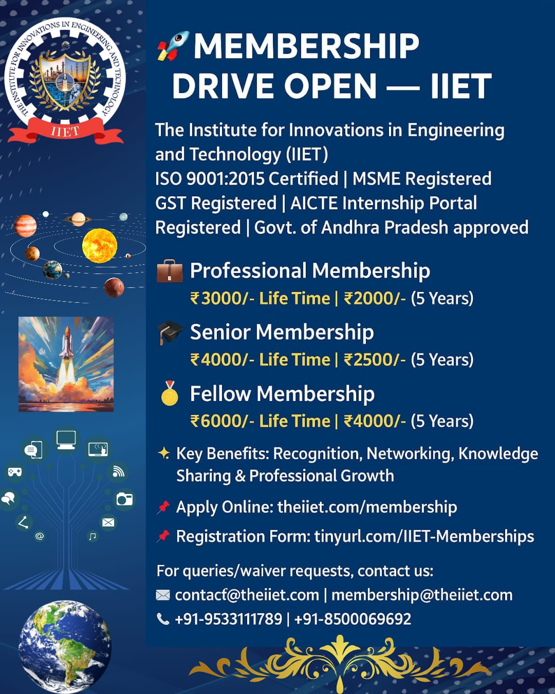 The Institute for Innovations in Engineering and Technology (IIET) — a Govt. of India and Govt. of Andhra Pradesh approved, MSME Registered, GST Registered, AICTE Internship Portal Registered, and ISO 9001:2015 Certified professional body, functioning under the IIETRAFI FOUNDATION, invites professionals, academicians, and researchers to …
